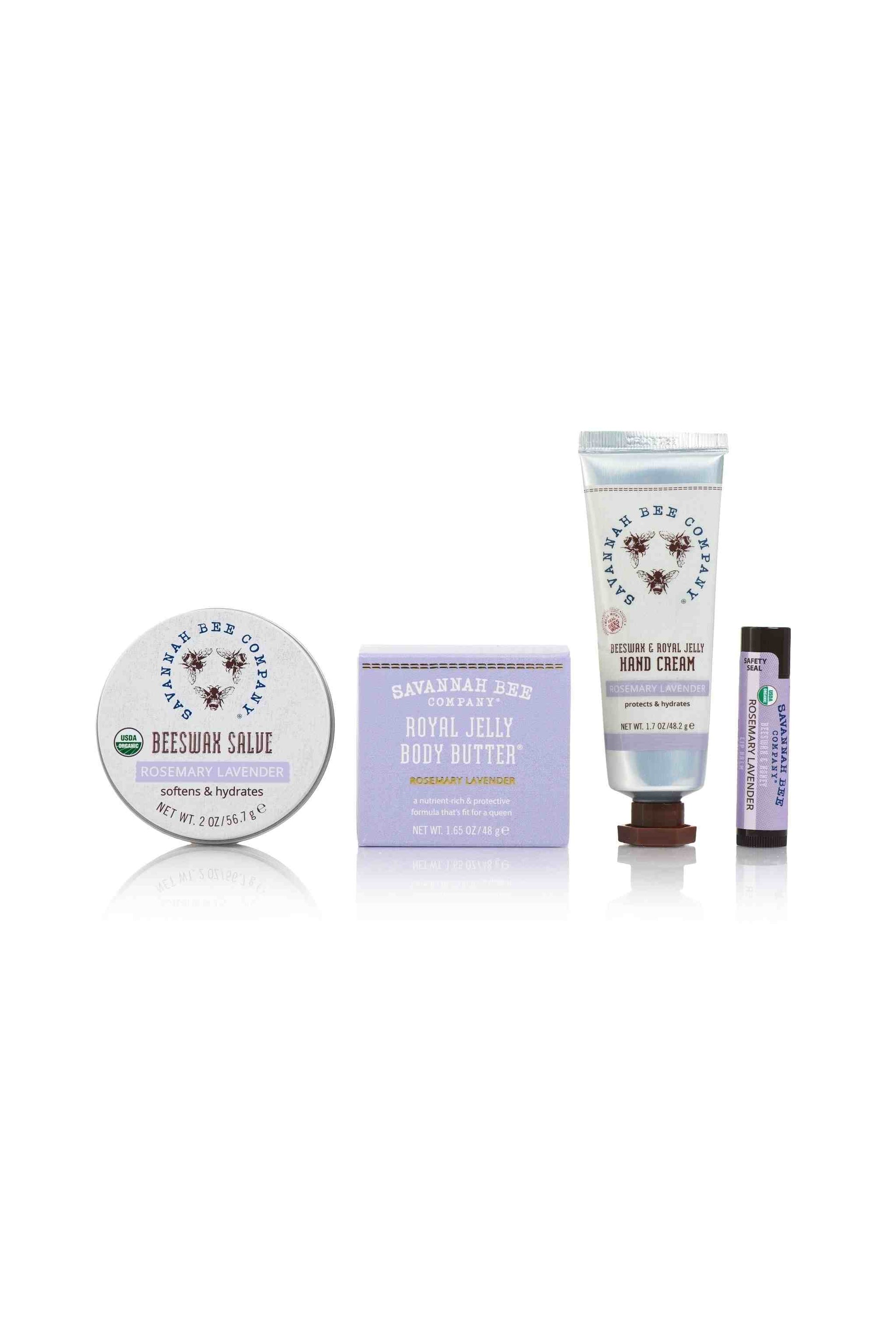 Wer in Ihrem Leben würde sich nur über diese aromatische Auswahl an Whippedhoney.ch Co. -Schönheitsprodukten aus unserer charakteristischen Rosmarin -Lavendel -Duftkollektion freuen? Beinhaltet die Versionen unserer Royal Jelly Body Butter, Bienenwachs und Royal Jelly-Handcreme, Bienenwachs-Hand Salve und eine Rohr aus Bienenwachs- und Honiglippenbalsam.